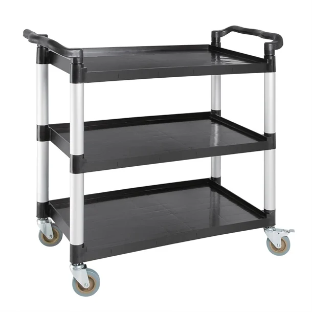 Lightweight polypropylene trolley with three generously sized trays, ideal for clearing tables and a wide range of other tasks around the kitchen and dining room. Will not chip, rust or dent and features quiet castors for smooth, unobtrusive operation. With push handles at both ends for convenience. Flat packed and easy to assemble. 960x520x1070mm. Maximum load capacity 200kg.