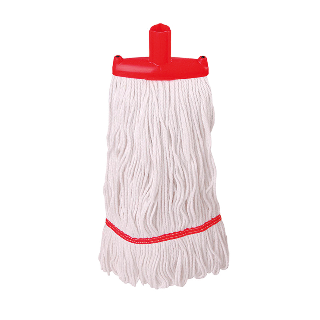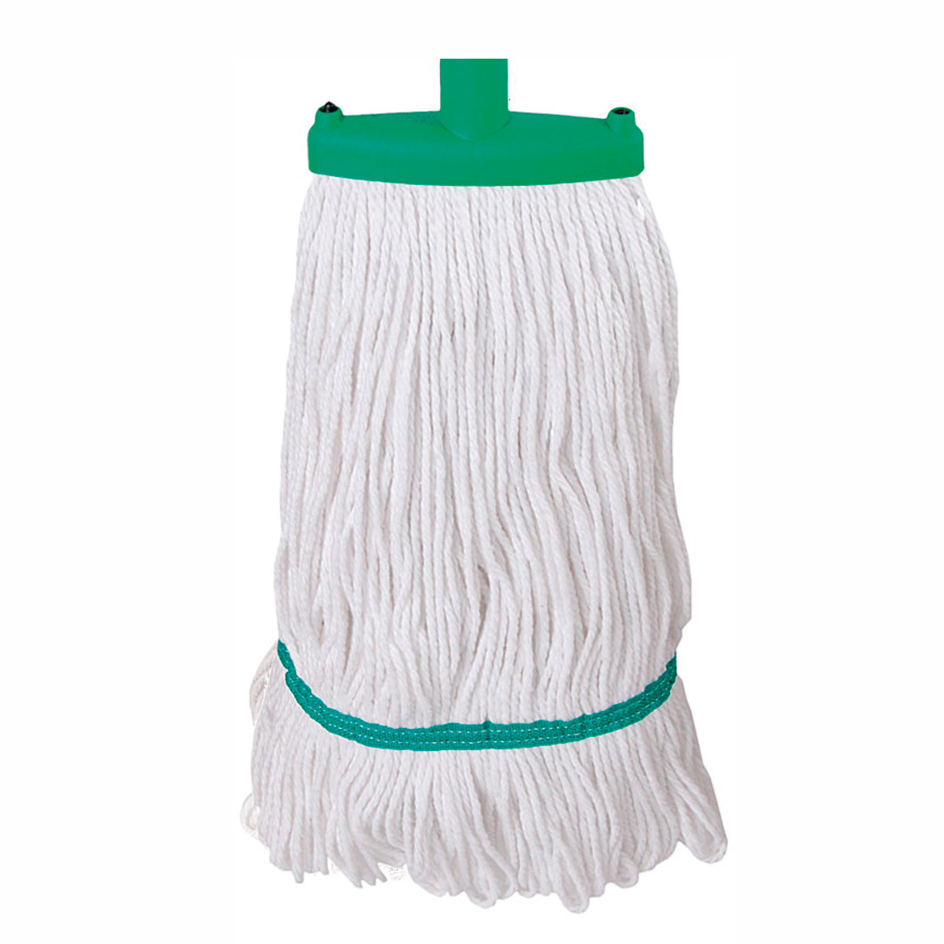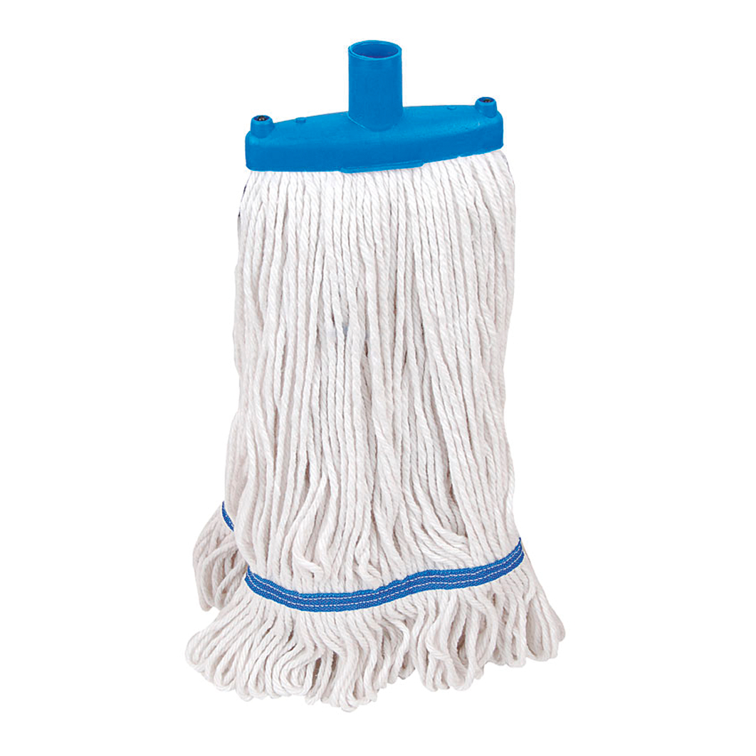 Washable Kentucky mop with stay flat looped ends made from a blend of cotton and polyester yarn. Available in four colours for hygiene coding.