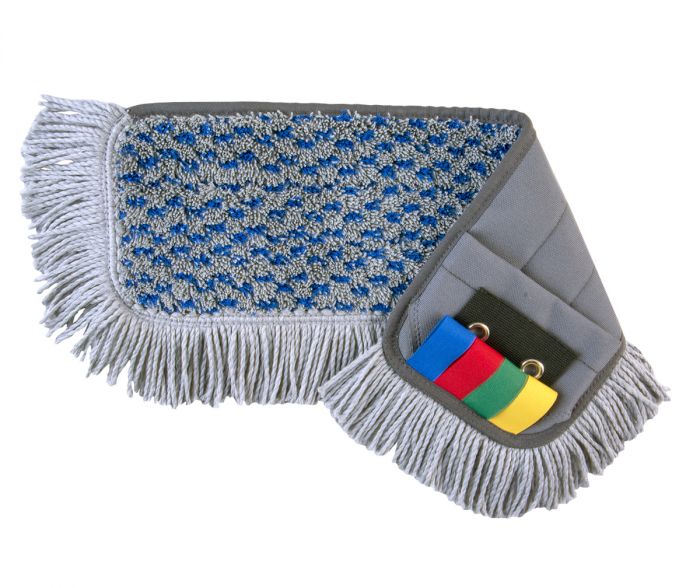 A versatile flat mop for heavily soiled areas, the Micro-fringe features a checked microfibre and scrub pattern, plus a fringe for removing loose dirt. The mop is washable with colour coded tabs.