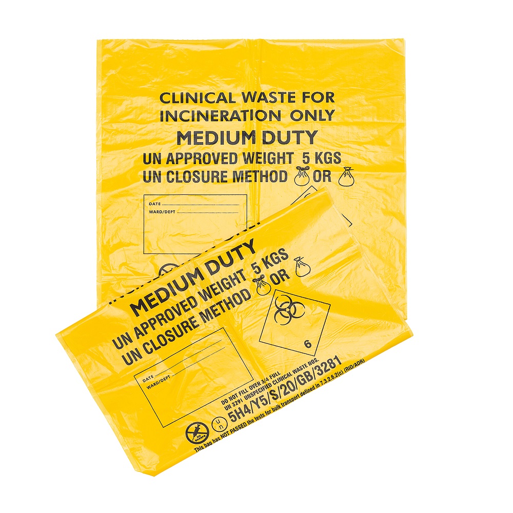 High quality, yellow clinical waste sacks for the safe and conspicuous disposal of contaminated items, excluding sharps. Also available in a smaller 16x24in size.