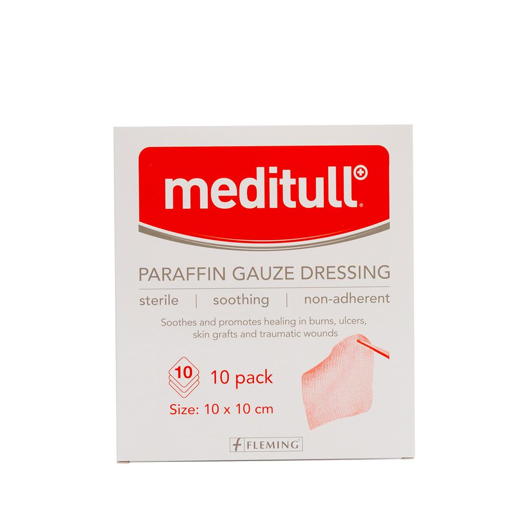 Meditull Parafin Gauze Dressing consists of a leno-weave fabric of 100% absorbent cotton thread, impregnated with white soft paraffin and is used as a primary wound contact layer. The dressing and the paraffin reduce the adherence of the product to the surface of a granulating wound.