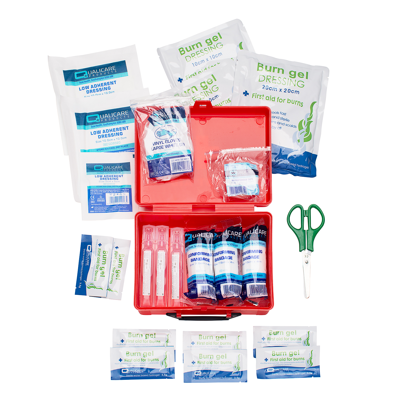 This burns kit contains high quality dressings for the immediate treatment of burns, including two gel dressings, 3 burn gel sachets, 2 conforming bandages, 6 safety pins, a pair of clothing scissiors, 2 pairs of gloves and a first aid leaflet.
